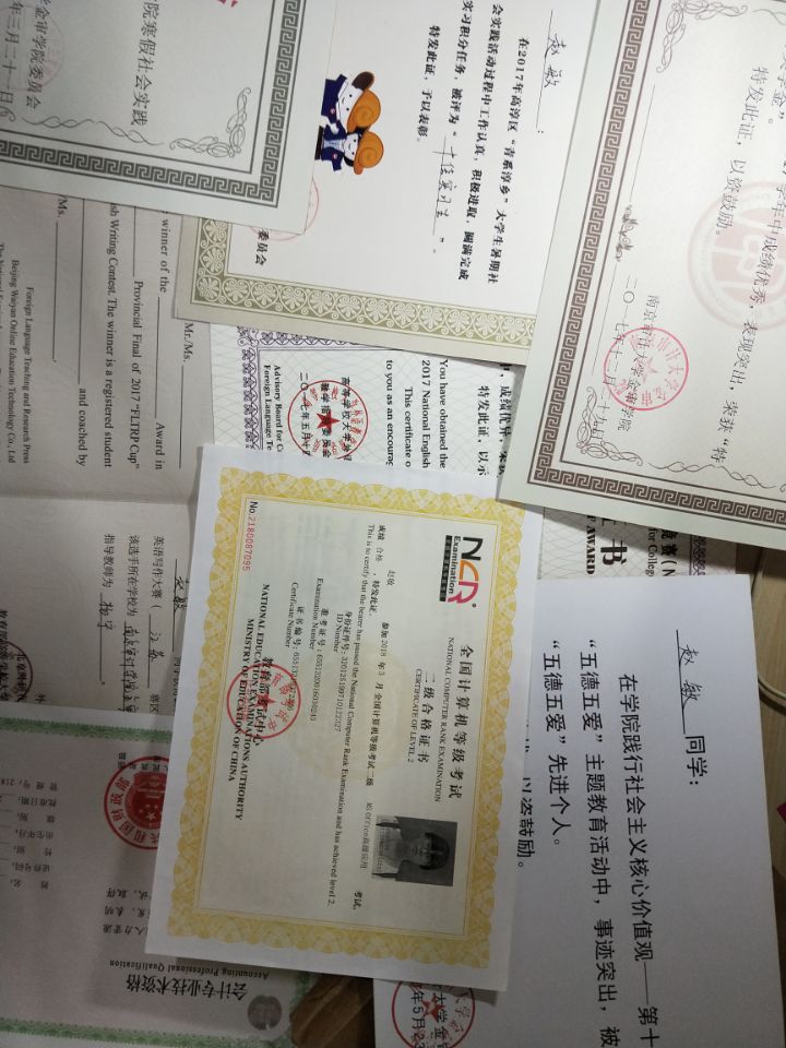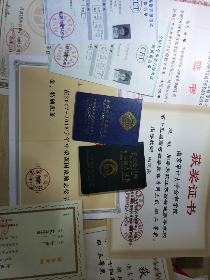 在學習方面,趙敏學姐勤奮好學,一絲不茍,她的績點高達4.11,成績保持名列前茅,可謂是個不折不扣的學霸。在學好專業(yè)課的同時,她還積極參與數(shù)學、英語及各種知識競賽,考取了多種相關專業(yè)證書。俗話說:紙上得來終覺淺,絕知此事要躬行,因此她也積極參加社會實踐活動,她在銀行和審計局進行過實習,曾獲“十佳實習生”稱號。眾所周知,英語四級六級、計算機等級考試是學生在大學階段普遍考取的證書,趙敏學姐在已通過這些考試的同時,還獲得了多份榮譽成就。2016-2017學年,趙敏學姐考取了會計證、證券從業(yè)資格證、數(shù)學競賽三等獎,英語競賽三等獎、獲得了寒假社會實踐優(yōu)秀個人獎、被評為“五德五愛”先進個人、獲得三好學生稱號、榮獲特等獎學金;2017-2018學年取得初級會計職稱證、普通話證書、“外研社杯”英語寫作大賽初賽特等獎、江蘇省三等獎、數(shù)學競賽二等獎;2018-2019學年即本學年,目前已取得基金從業(yè)資格證、期貨從業(yè)資格證、管理會計證、全國大學生會計信息化技能大賽江蘇省一等獎、全國三等獎。我們經常會聽聞一些關于優(yōu)秀人士的“傳奇故事”,但當近距離的感受這種優(yōu)秀時,帶給你的不僅是目瞪口呆的反應,更是一種源于優(yōu)秀力量帶來的心靈沖擊感。
