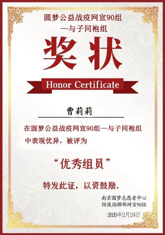 在得知可以報名成為線上志愿者,通過線上的志愿服務為疫情盡一份責任后,她便毅然決然的報名,加入到南京圓夢志愿者組織中,成為他們線上戰(zhàn)疫志愿者的一員。曹莉莉同學主要負責通過QQ空間、朋友圈、抖音、微博等平臺對于有關疫情的新聞、文章進行轉載、宣傳,為大家做疫情相關的科普,避免大家面對疫情時過于緊張、焦慮的心理。