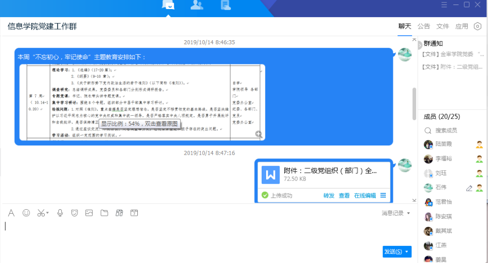 信息學(xué)院全體師生黨員加入黨建工作群,工作群的建立,提升了“不忘初心、牢記使命”主題教育的學(xué)習(xí)參與度和計(jì)劃性,黨總支可以及時(shí)發(fā)布每周主題教育的安排,如文件精神、黨建工作動(dòng)態(tài)、會(huì)議通知等,進(jìn)一步提高黨建工作效能水平,全體黨員可以在線進(jìn)行實(shí)時(shí)回復(fù)和互動(dòng)。1、創(chuàng)建黨建工作群