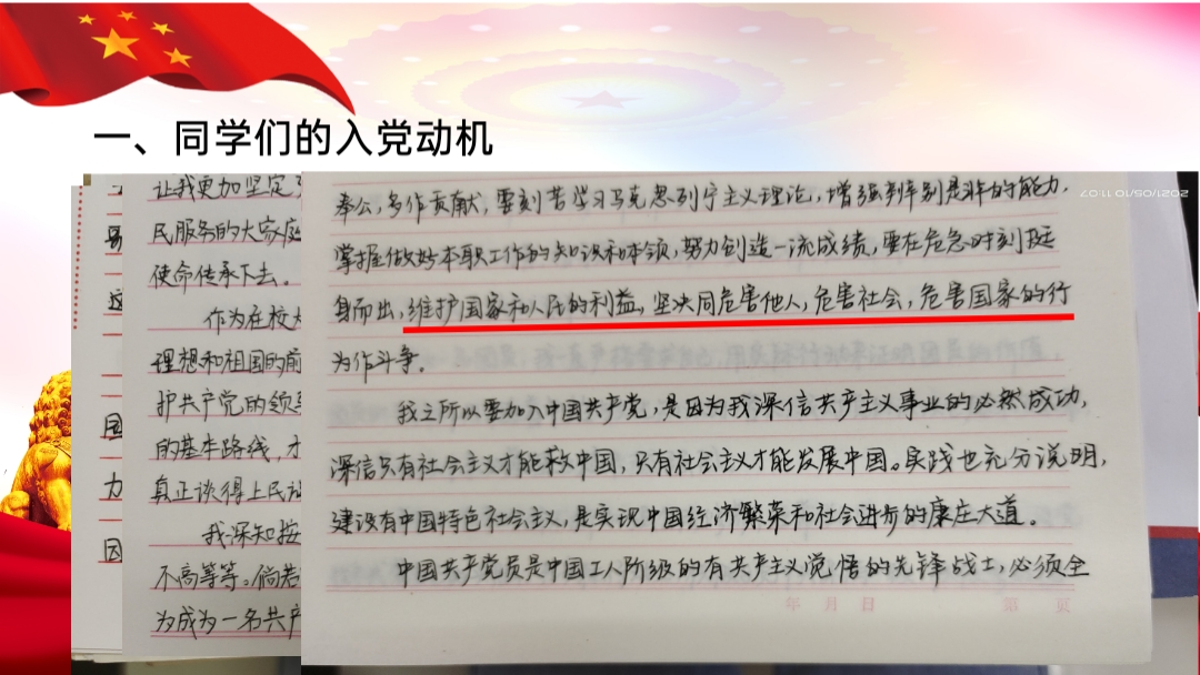 其次,孫老師還向同學(xué)們講述了三個歷史偉人的故事。一是朱德苦苦追尋跟隨黨的步伐,二是焦裕祿的三份入黨申請書,三是年高83歲的牛犇莊嚴(yán)宣誓加入中國共產(chǎn)黨。一個個感人至深的故事、一段段令人動容的文字讓大家深刻感悟到革命先輩的精神力量。對于宣講團成員和黨員學(xué)生來講,這是一次感觸深刻的黨性教育,使得大家對黨史的宣講工作具有更加堅定的信念和動力。