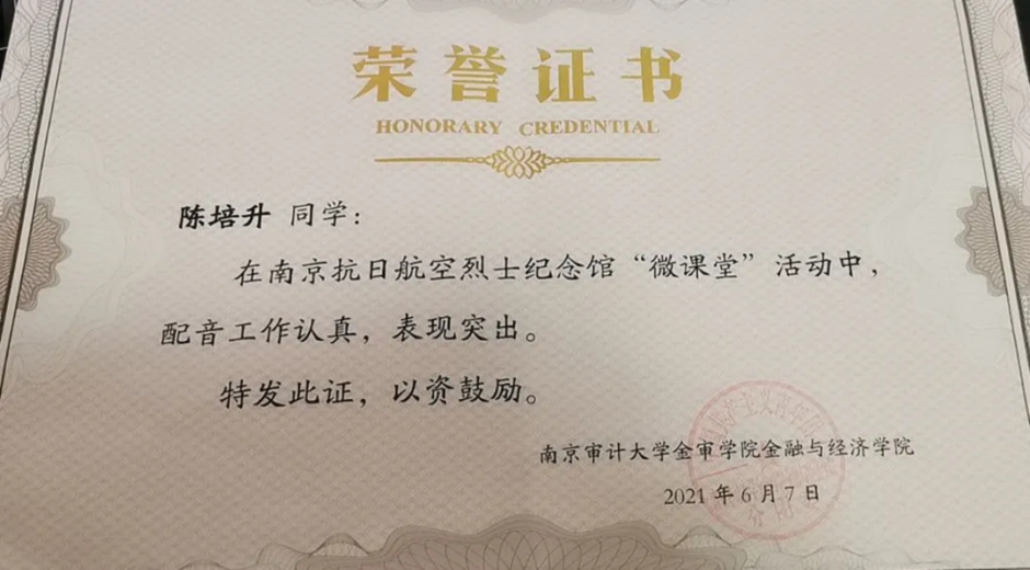有了南京博物院的服務(wù)經(jīng)驗(yàn),陳培升報(bào)名并通過(guò)考核成為了南京抗日航空烈士紀(jì)念館的講解員,在紀(jì)念館內(nèi)講解烈士們的英勇事跡與我國(guó)空軍的前世今生。