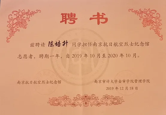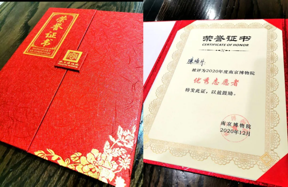 源自對(duì)中國(guó)傳統(tǒng)文化的熱愛(ài),陳培升大一時(shí)參加了南博金審團(tuán)隊(duì)的招新。經(jīng)過(guò)三輪面試兩輪筆試和三個(gè)月的實(shí)習(xí)期,正式成為南京博物院的一名志愿者。