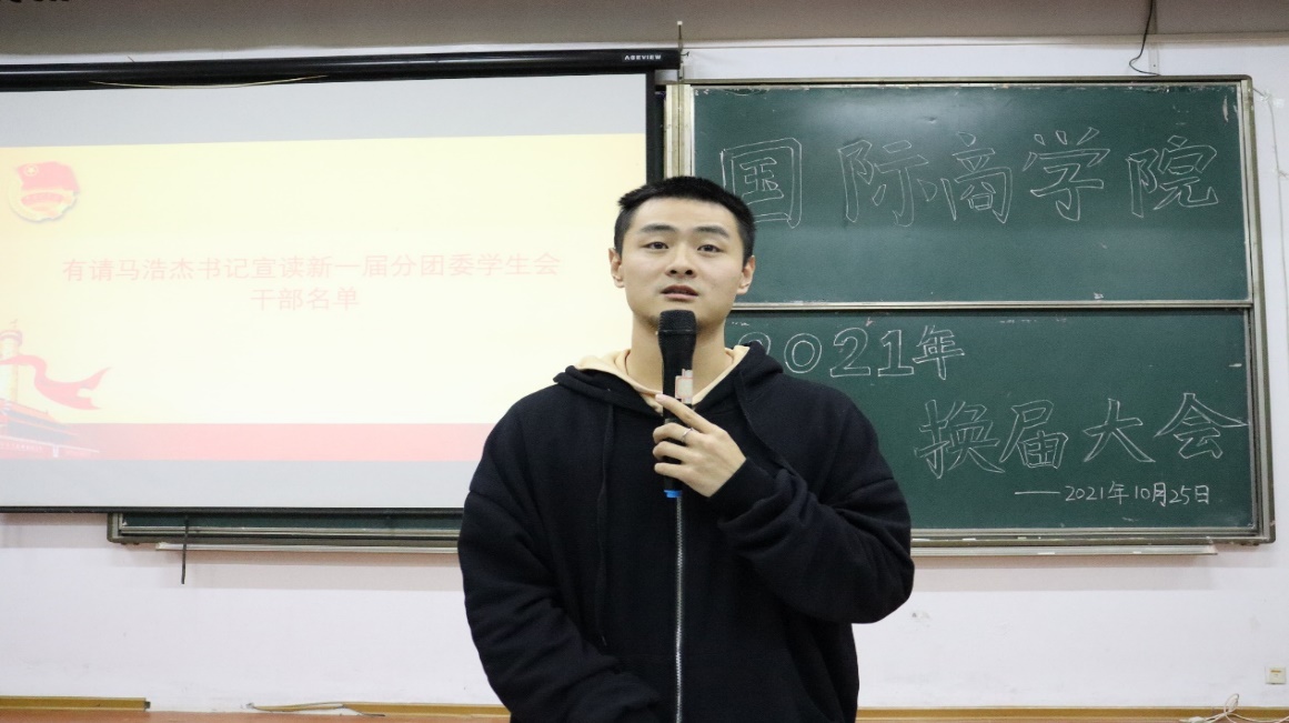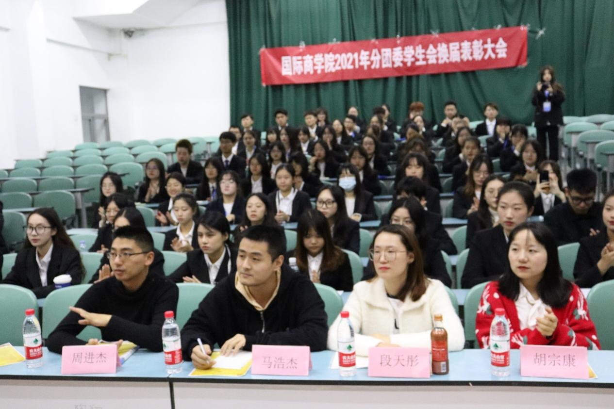 蒞臨本次大會(huì)的有國(guó)際商學(xué)院黨總支書記莊懷軍、分團(tuán)委書記馬浩杰,各年級(jí)輔導(dǎo)員胡宗康老師、段天彤老師、周進(jìn)杰老師。