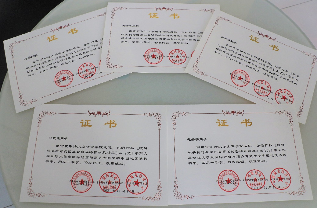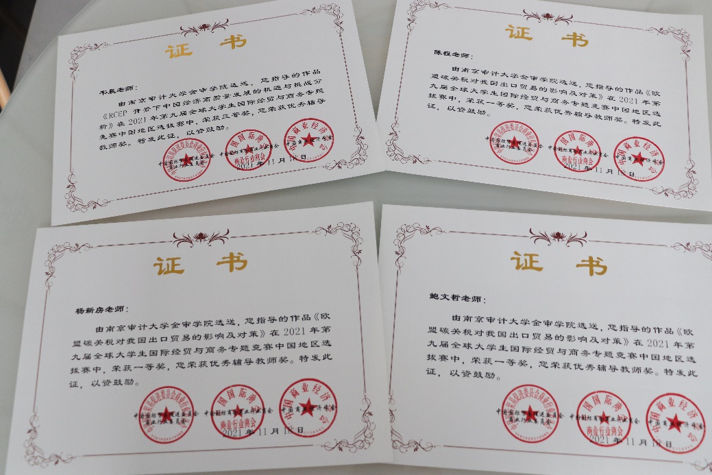 本次比賽由中國國際貿(mào)易促進(jìn)委員會行業(yè)委員會和中國國際商業(yè)行業(yè)商會聯(lián)合主辦,是國際貿(mào)易學(xué)科規(guī)格較高的一項賽事。此次比賽共有來自全國40所高校的150支隊伍參加。我校派出的三支隊均獲得較好名次,其中由陳程、鮑文哲、楊新房三位老師指導(dǎo),葉婷、馬思遙、范澄宇、施沛淇、褚斯鈺、張凱歌六位參賽選手完成的作品“歐盟碳關(guān)稅對我國出口貿(mào)易的影響及對策”,與由孫忠悅、韋晨兩位老師指導(dǎo),李許怡、徐倩、朱嘉禧、黃千禧、劉天意五位參賽選手完成的作品“論國際營銷的思維轉(zhuǎn)變——逆向營銷”兩個作品榮獲一等獎;由韋晨、孫忠悅兩位老師指導(dǎo),猶沅、劉暢、王怡雯、孫嫻、莊泳飛五位選手完成的作品“RCEP 背景下中國經(jīng)濟高質(zhì)量發(fā)展的機遇與挑戰(zhàn)分析”榮獲三等獎。同時,南京審計大學(xué)金審學(xué)院榮獲“最佳院校組織獎”,陳程、鮑文哲、韋晨、孫忠悅、楊新房五位老師獲得“最佳指導(dǎo)教師獎”。