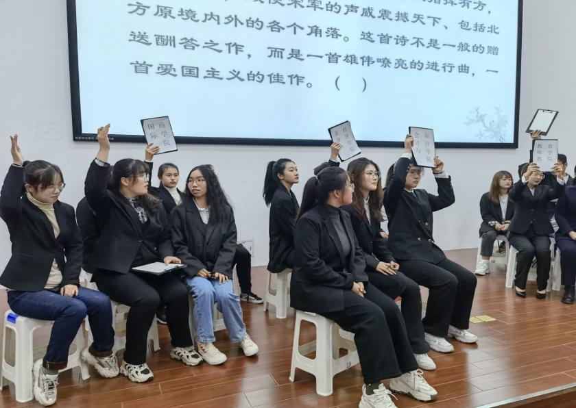 第二部分是搶答環(huán)節(jié),各院選手踴躍作答,從容不迫地回答主持人提出的問(wèn)題。從范成大的《望鄉(xiāng)臺(tái)》到秋瑾的《滿江紅》,樓臺(tái)后香徑中彌漫縈繞的鄉(xiāng)愁情愫,又快步到期望民族振興追尋人生的道路上。在如此魅力的情景變換中,選手們娓娓道來(lái),泰然自若,并對(duì)題目的背景予以補(bǔ)充與說(shuō)明。每位選手對(duì)詩(shī)詞所蘊(yùn)含的情感都有不同的見解,不同的解釋構(gòu)成了多維度的回應(yīng),現(xiàn)場(chǎng)可謂是氣勢(shì)十足,熱鬧非凡,可見選手們的文化詩(shī)詞底蘊(yùn)之厚重,深感文人筆下情感之深切。