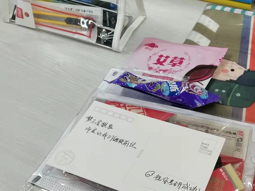 在臨近考試的前一周,他倍感焦慮,但去考研教室時驚喜地遇到學院老師在給每一位考研同學送考研大禮包,里面放著祝福“一戰(zhàn)成碩”的卡片和貼心的文具。小鼓勵,大能量,他在心里暗暗堅定了自己考研的信念。