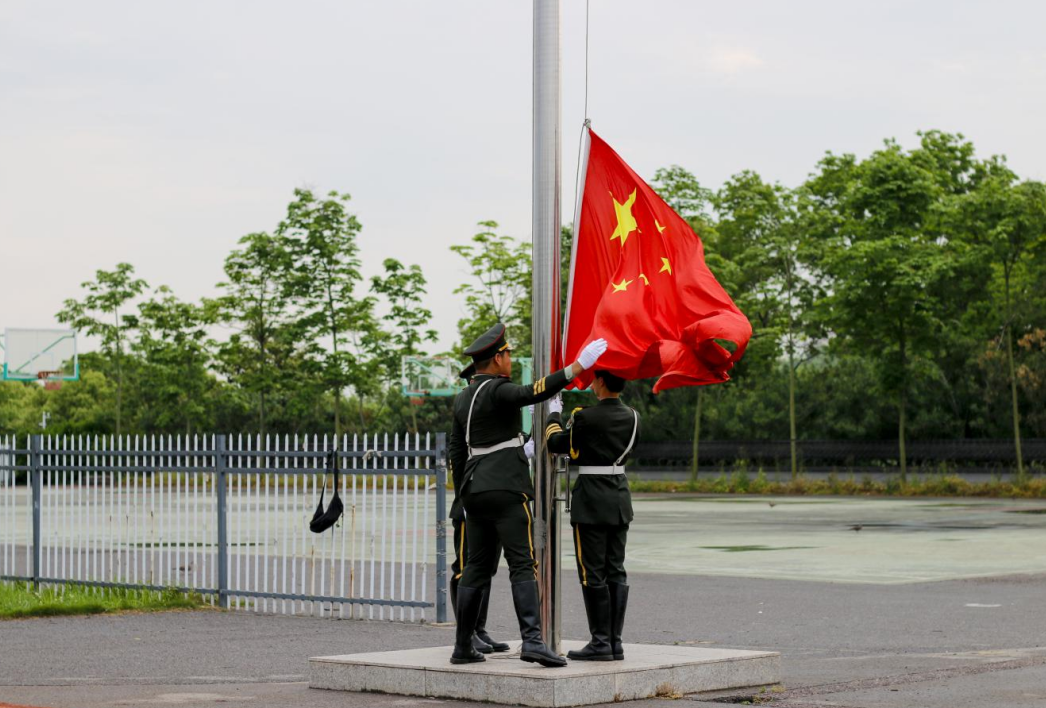 國旗護衛(wèi)隊護送著五星紅旗在莊嚴(yán)的國歌聲中冉冉升起,全體師生肅目敬禮。