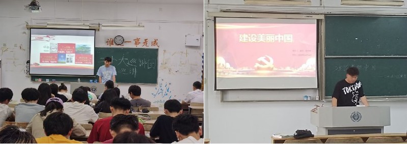巡講團成員、21級計算機專業(yè)姜天和信管專業(yè)沈子欽同學以“建設美麗中國”為主題,從形成背景、未來發(fā)展、建設意義等方面,為同學們深入講解了建設美麗中國方針政策的重要意義,并向同學們提出了我們該做什么、怎樣做的青年思考,讓同學們從思考中進一步體悟當代青年的責任擔當。