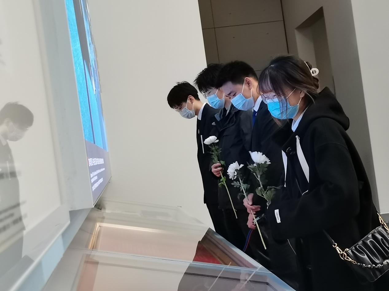 走出陳列廳,同學們?yōu)橛鲭y的同胞們敬獻鮮花,告慰英靈。隨后來到勝利之墻與和平廣場,吹著沖鋒號的戰(zhàn)士,象征著中華民族戰(zhàn)勝了窮兇極惡的法西斯,走向了手持和平鴿的和平女神。