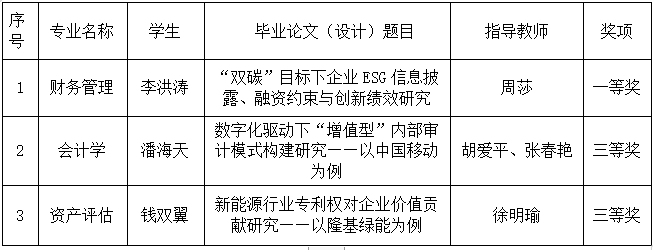其中,會計與審計學(xué)院周莎老師指導(dǎo)的畢業(yè)論文《“雙碳”目標(biāo)下企業(yè)ESG信息披露、融資約束與創(chuàng)新績效研究》獲得一等獎;會計與審計學(xué)院胡愛平和張春燕老師共同指導(dǎo)的畢業(yè)論文《數(shù)字化驅(qū)動下“增值型”內(nèi)部審計模式構(gòu)建研究——以中國移動為例》獲得三等獎;管理學(xué)院資產(chǎn)評估專業(yè)徐明瑜老師指導(dǎo)的畢業(yè)論文《新能源行業(yè)專利權(quán)對企業(yè)價值貢獻(xiàn)研究——以隆基綠能為例》獲得三等獎。具體見下表: