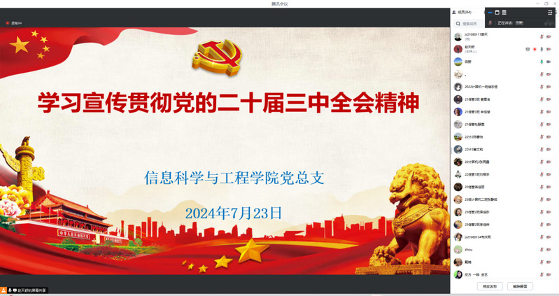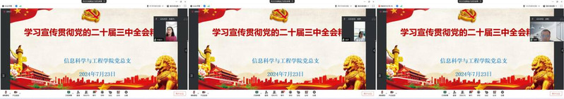 2024年7月15日至18日,中國(guó)共產(chǎn)黨第二十屆中央委員會(huì)第三次全體會(huì)議在北京勝利召開。為深入學(xué)習(xí)宣傳貫徹全會(huì)精神,統(tǒng)一全院師生思想,凝聚共識(shí),按照校黨委工作部署,信息學(xué)院于7月23日下午線上召開了黨的二十屆三中全會(huì)精神學(xué)習(xí)交流會(huì),參加本次會(huì)議的有信息學(xué)院全體師生黨員和入黨積極分子。