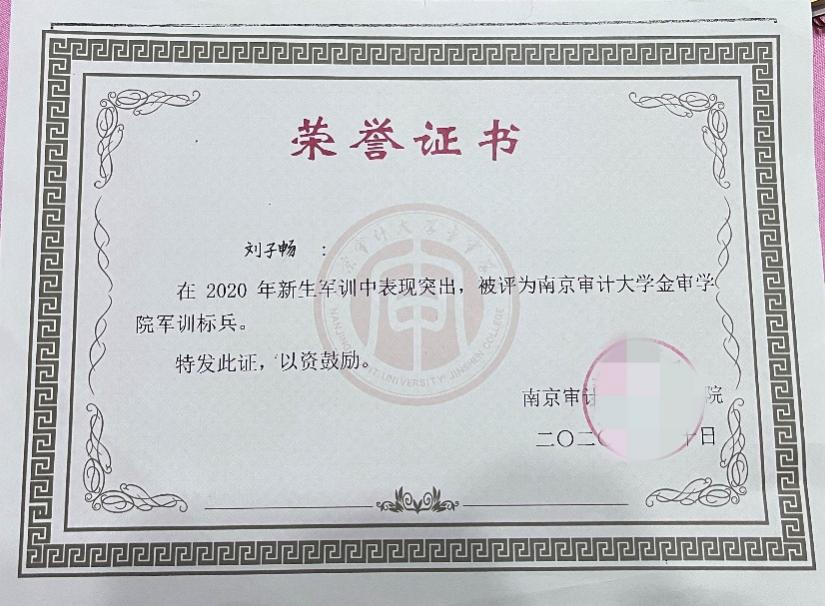 剛?cè)雽W(xué)時(shí),在新生軍訓(xùn)中她表現(xiàn)出色,被評(píng)為“軍訓(xùn)標(biāo)兵”;在社團(tuán)工作中,被選為國(guó)旗護(hù)衛(wèi)隊(duì)大型元旦晚會(huì)主持人,并參演話劇,臨場(chǎng)隨機(jī)應(yīng)變,為領(lǐng)導(dǎo)和同學(xué)們帶來(lái)一場(chǎng)視覺(jué)盛宴。同時(shí)她擔(dān)任南京抗日航空烈士紀(jì)念館志愿講解員,課余時(shí)間學(xué)習(xí)館內(nèi)陳設(shè)解說(shuō)詞,繪聲繪色,講解極具感染力,使觀看者身在其中;2020年12月13日,作為學(xué)生代表在此館發(fā)言,接受了記者的采訪。