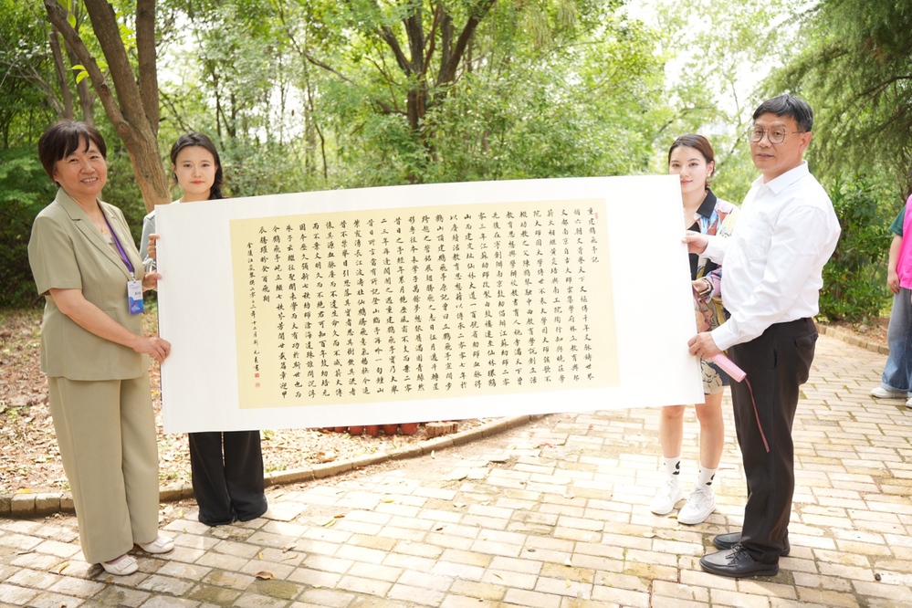 儀式上,教師教育學(xué)院向?qū)W校捐贈(zèng)《鶴飛亭記》《重建鶴飛亭記》書(shū)法作品,校領(lǐng)導(dǎo)為教師教育學(xué)院師生校友代表頒發(fā)《捐贈(zèng)贈(zèng)書(shū)》,與師生校友共同為《鶴飛亭記》石刻揭幕。