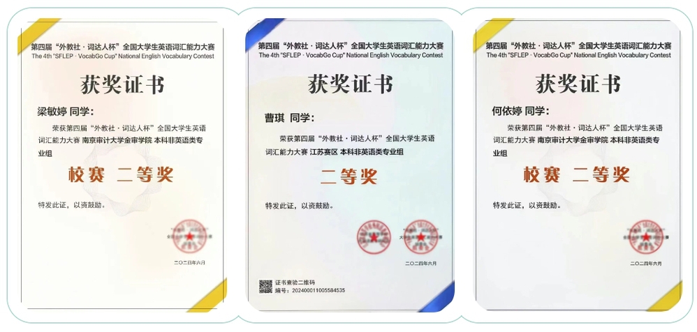 在學科競賽中,曹琪、袁宇洋等同學斬獲第四屆 “外研社﹒詞達人杯” 全國大學生英語詞匯能力大賽江蘇賽區(qū)二等獎,展現(xiàn)出強勁的綜合實力。