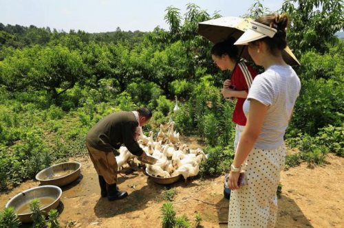 調(diào)研中,團隊還走訪了當?shù)夭鑸@、養(yǎng)殖區(qū),用鏡頭捕捉山區(qū)多元農(nóng)產(chǎn)的生機。云霧繚繞的山坡上,茶葉吸納山間靈氣;綠蔭處鴨群嬉戲,肉質(zhì)緊實;圈養(yǎng)的土豬以山間野菜為食,口感醇厚。這些充滿原生態(tài)氣息的農(nóng)產(chǎn),與桃子共同構成亭子村“山野好物”的豐富圖譜,為團隊拓寬了品牌設計的覆蓋范圍。
