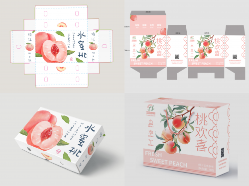 基于調(diào)研成果,品牌設計組耗時兩天完成了從海報到包裝的全體系設計。以“山”“桃” 為核心元素的品牌標志靈動鮮活,飽滿的桃形輪廓與層疊山影相融,盡顯水蜜桃生長的自然意境。包裝采用可降解秸稈材料,融入當?shù)靥俾y樣與產(chǎn)品賣點插畫——圓潤飽滿的水蜜桃綴著細絨毛,切開的果肉泛著瑩潤粉白,汁水順著果縫微微流淌,那股子鮮嫩勁兒躍然紙上。