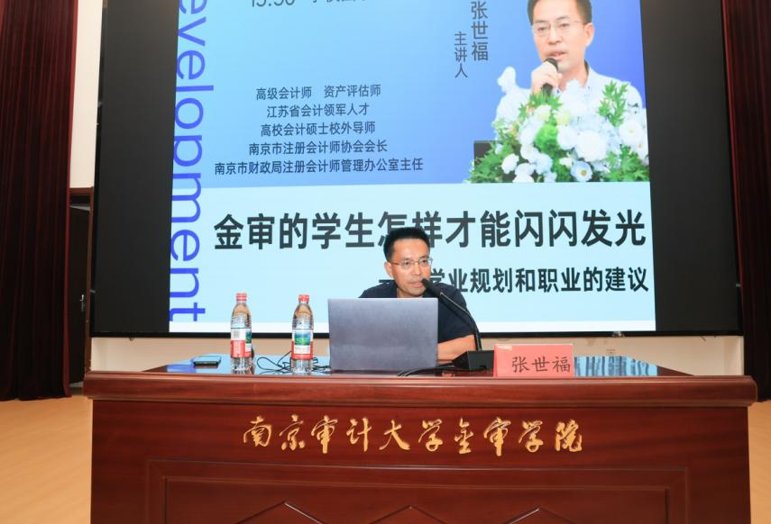 隨后,張世福會(huì)長(zhǎng)開(kāi)展題為《金審的同學(xué)怎樣才能閃閃發(fā)光——學(xué)業(yè)規(guī)劃與職業(yè)規(guī)劃建議》的專題講座。講座圍繞學(xué)生職業(yè)發(fā)展路徑選擇,結(jié)合行業(yè)前沿動(dòng)態(tài)與實(shí)務(wù)經(jīng)驗(yàn),為學(xué)子提供系統(tǒng)性指導(dǎo),審計(jì)學(xué)院教職工及部分學(xué)生參與了講座。張會(huì)長(zhǎng)指出,大三階段是職業(yè)發(fā)展的關(guān)鍵分水嶺,是考研與就業(yè)的雙軌規(guī)劃。針對(duì)考研學(xué)生,他建議明確目標(biāo)院校、制定14個(gè)月備考計(jì)劃,強(qiáng)調(diào)“集中精力,一戰(zhàn)上岸”;對(duì)選擇就業(yè)的學(xué)生,則提出“課程+實(shí)習(xí)+證書(shū)”的復(fù)合路徑,推薦大四報(bào)考注冊(cè)會(huì)計(jì)師(CPA),并通過(guò)多段實(shí)習(xí)積累經(jīng)驗(yàn)。同時(shí)核心競(jìng)爭(zhēng)力構(gòu)建策略非常重要,?職業(yè)成功需依托“專業(yè)資質(zhì)+實(shí)踐經(jīng)驗(yàn)+跨界能力”。他呼吁學(xué)生關(guān)注新興行業(yè)的地域分布,結(jié)合江蘇本土上市公司資源優(yōu)化就業(yè)選擇。講座中還通過(guò)多個(gè)案例展示“專業(yè)+證書(shū)”的復(fù)合路徑,凸顯跨界能力的市場(chǎng)價(jià)值。最后,張會(huì)長(zhǎng)以“戰(zhàn)略能力決定方向,學(xué)習(xí)能力決定高度”寄語(yǔ)學(xué)子,鼓勵(lì)其結(jié)合自身特點(diǎn)走特色成才道路。