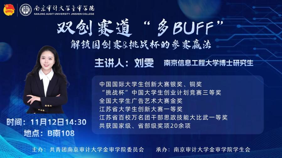 為培養(yǎng)學(xué)生學(xué)術(shù)實(shí)踐和創(chuàng)新創(chuàng)業(yè)能力,幫助同學(xué)們了解“挑戰(zhàn)杯”、“中國(guó)國(guó)際大學(xué)生創(chuàng)新大賽”賽事的備賽技巧,更精準(zhǔn)地規(guī)劃參賽方向,11月12日14:30,南京審計(jì)大學(xué)金審學(xué)院團(tuán)委特邀南京信息工程大學(xué)博士研究生劉雯,在B南108開展“雙創(chuàng)賽道‘多BUFF’——解鎖國(guó)創(chuàng)賽&挑戰(zhàn)杯的參賽贏法”主題講座,為金審學(xué)子送上滿滿備賽干貨。