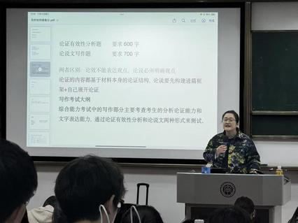 講座現(xiàn)場(chǎng),講師用“600字論效+700字論說(shuō)”的字?jǐn)?shù)要求為錨點(diǎn),拆解了不同題型的寫作節(jié)奏:論效需快速定位材料中的邏輯謬誤,用“指出漏洞-分析錯(cuò)誤-總結(jié)影響”的三段式結(jié)構(gòu)高效成文;論說(shuō)則要先確立明確觀點(diǎn),通過(guò)“引論-本論-結(jié)論”的框架展開(kāi),搭配案例、數(shù)據(jù)等素材增強(qiáng)說(shuō)服力。臺(tái)下學(xué)生邊聽(tīng)邊記,不少人在筆記上標(biāo)注出“框架優(yōu)先”“非語(yǔ)言表達(dá)不可取”等關(guān)鍵要點(diǎn)。
