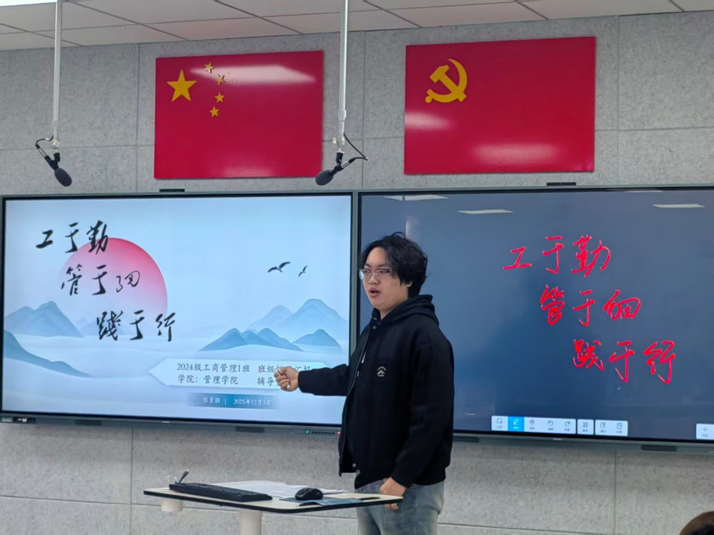 “34名學(xué)子同心聚力,6名少數(shù)民族同學(xué)多元相融,這是一個充滿活力與溫度的集體!”活動伊始,班長陳景灝以翔實的數(shù)據(jù)和生動的案例,全面展現(xiàn)了班級的精神風(fēng)貌與建設(shè)成效。他圍繞“工于勤,管于細,踐于行”的班訓(xùn),從班級概況、學(xué)風(fēng)建設(shè)、集體活動、未來規(guī)劃四大維度展開介紹,無論是團課班會100%的參與率、11人斬獲各類獎學(xué)金的亮眼成績,還是連續(xù)兩學(xué)期榮獲“優(yōu)良班風(fēng)班”的榮譽加持,都彰顯著班級的凝聚力與戰(zhàn)斗力。從運動會上的并肩拼搏到志愿服務(wù)中的無私奉獻,從學(xué)習(xí)研討中的思維碰撞到日常生活中的互助友愛,陳景灝的講述讓在場師生真切感受到這個集體“勤學(xué)善思、團結(jié)奮進”的良好氛圍。