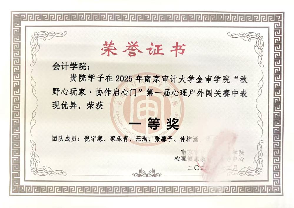 2025年11月10日,南京審計大學金審學院首屆“秋野心玩家?協(xié)作啟心門”心理戶外闖關(guān)賽在歡騰的氛圍中順利落下帷幕。由我院學子組成的參賽隊伍憑借出色的團隊協(xié)作與昂揚的精神風貌與競賽精神,在眾多隊伍中脫穎而出,會計學院榮獲賽事一等獎。