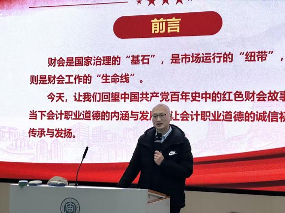 為深入傳承紅色金融基因,厚植財(cái)會(huì)專(zhuān)業(yè)學(xué)子職業(yè)道德根基,引導(dǎo)青年學(xué)子牢固樹(shù)立誠(chéng)信執(zhí)業(yè)理念,會(huì)計(jì)學(xué)院于12月17日下午,在B南109教室隆重舉辦紅色財(cái)經(jīng)專(zhuān)題講座。本次講座特邀南京林業(yè)大學(xué)經(jīng)濟(jì)管理學(xué)院副院長(zhǎng)鄧德強(qiáng)教授擔(dān)任主講嘉賓,圍繞“財(cái)會(huì)誠(chéng)信與職業(yè)道德”核心主題展開(kāi)深度分享,與現(xiàn)場(chǎng)師生共同探尋紅色財(cái)經(jīng)精神的時(shí)代內(nèi)涵,擘畫(huà)新時(shí)代財(cái)會(huì)人踐行職業(yè)操守的實(shí)踐路徑。