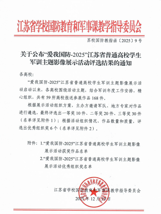 近日,江蘇省學(xué)校國防教育和軍事課教學(xué)指導(dǎo)委員會公布了“愛我國防-2025”江蘇省普通高校學(xué)生軍訓(xùn)主題影像展示活動評選結(jié)果,南京審計(jì)大學(xué)金審學(xué)院會計(jì)學(xué)院孫旖雯同學(xué)的作品《后浪》榮獲江蘇省二等獎。