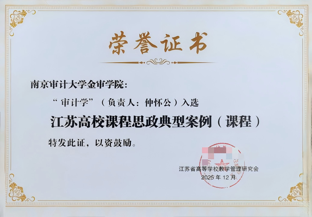 近日,江蘇省高等學(xué)校教學(xué)管理研究會(huì)、課程思政建設(shè)工作委員會(huì)公布了2025年江蘇普通本科高校課程思政典型案例入選名單,審計(jì)學(xué)院仲懷公教授的《審計(jì)學(xué)》課程成功入選。