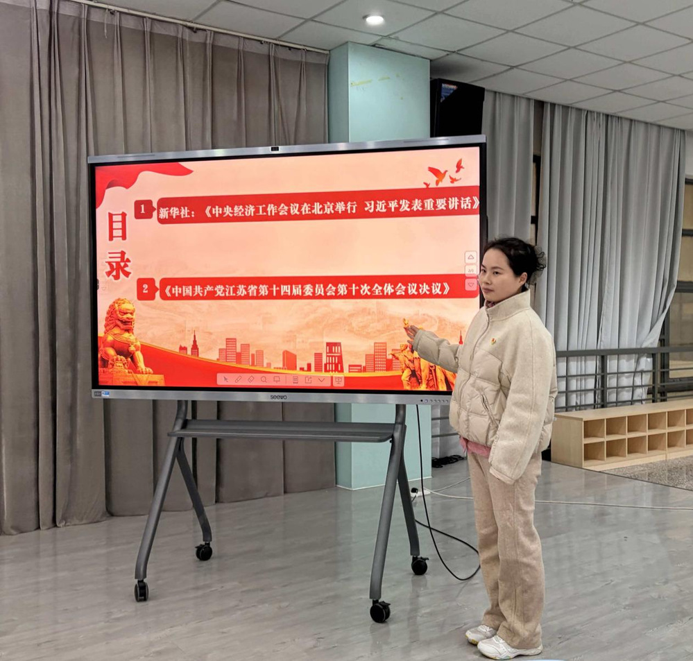本次學(xué)習(xí)聚焦《中央經(jīng)濟(jì)工作會議在北京舉行習(xí)近平發(fā)表重要講話》與《中國共產(chǎn)黨江蘇省第十四屆委員會第十次全體會議決議》兩份核心材料。會上,黨員教師依次領(lǐng)讀原文段落,通過“讀、聽、思”相結(jié)合的方式,原原本本、逐字逐句學(xué)習(xí)領(lǐng)會中央精神與省委部署,現(xiàn)場學(xué)習(xí)氛圍莊重而熱烈。