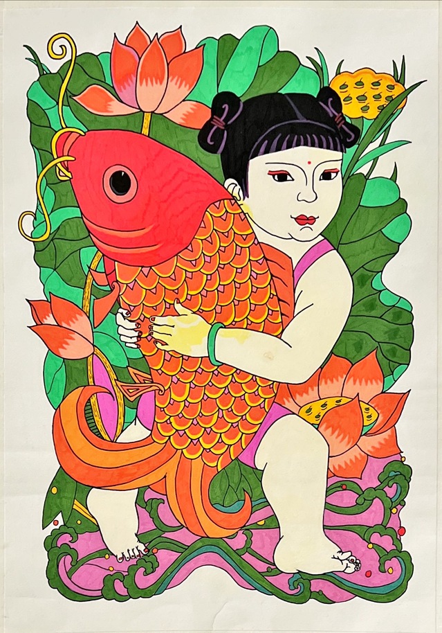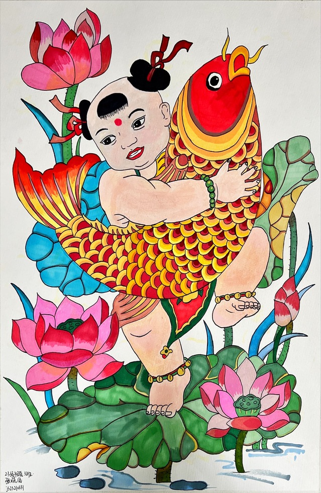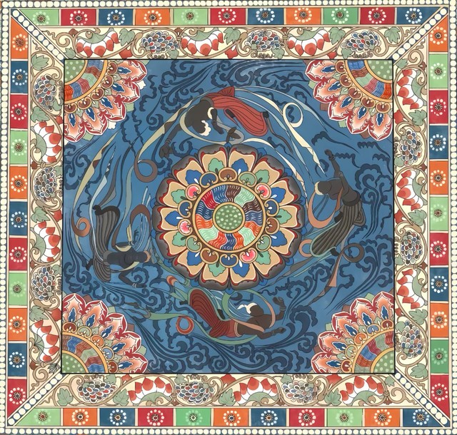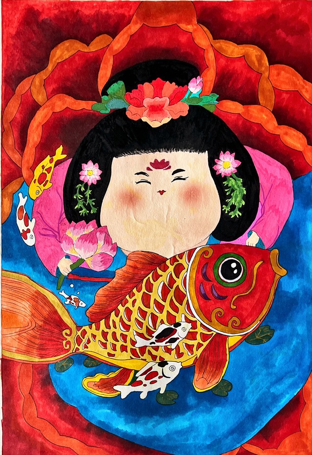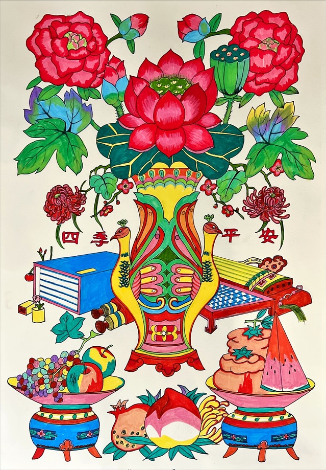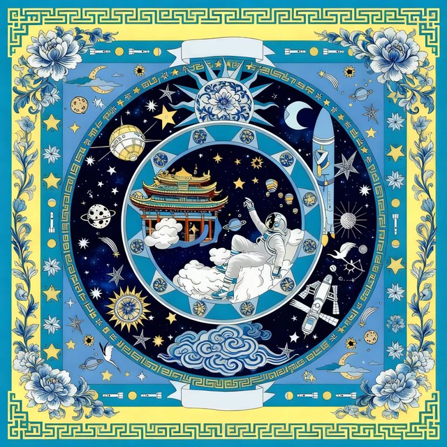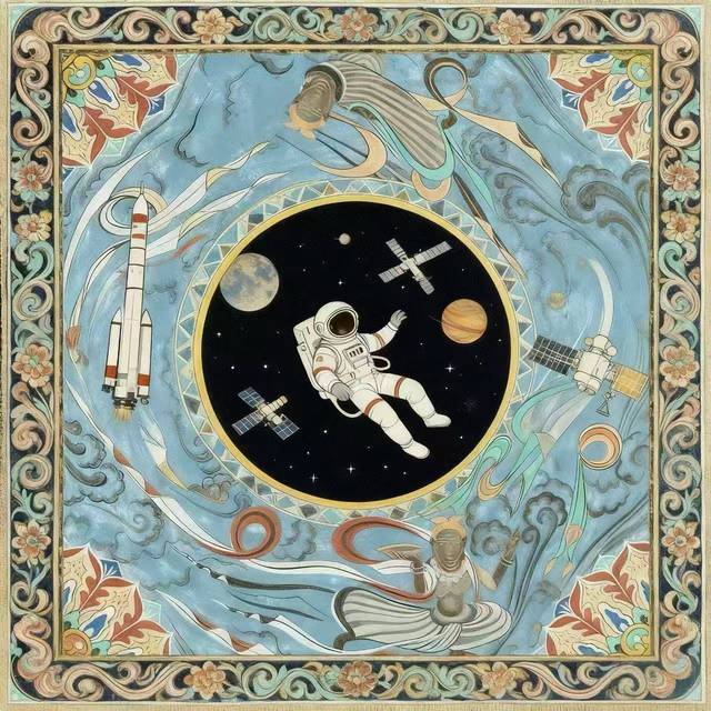 本次展覽的創(chuàng)作主題橫跨“年畫新繹”“藻井幻化”“幸福刻度”與“星際之紋”四大領(lǐng)域。學生們不僅通過精湛的手繪功底,賦予年畫以當代溫度、再現(xiàn)敦煌藻井的繁復肌理,更巧妙地運用AIGC技術(shù),構(gòu)建出描繪日常生活的色彩圖譜與充滿未來感的航天視覺意象。兩種創(chuàng)作方式在作品中形成了有機互補:手繪奠定了設(shè)計的筋骨與情感內(nèi)核,而智能生成技術(shù)則作為創(chuàng)意輔助與思維延伸工具,極大地拓展了視覺表達的邊界。