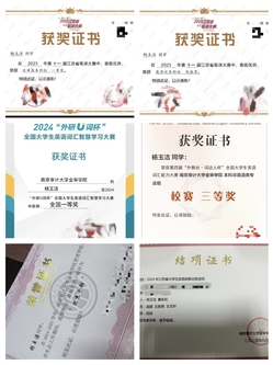 楊玉潔積極投身校園清掃、新街口志愿服務(wù)等實踐活動,用行動詮釋青春擔當。專業(yè)領(lǐng)域里,她作為核心成員征戰(zhàn)第十二屆“學創(chuàng)杯”江蘇省模擬賽,憑借過硬的專業(yè)素養(yǎng)與默契的團隊協(xié)作,斬獲省級特等獎與國家級一等獎,完美實現(xiàn)理論與實踐的深度融合。她連續(xù)兩年參加“外研U詞杯”全國英語詞匯大賽,均獲全國一等獎,盡顯卓越語言能力;在第十一屆“LSCAT”杯江蘇省筆譯大賽中,一舉奪得漢譯英本科組一等獎與英譯漢本科組優(yōu)勝獎,進一步彰顯綜合語言素養(yǎng)。