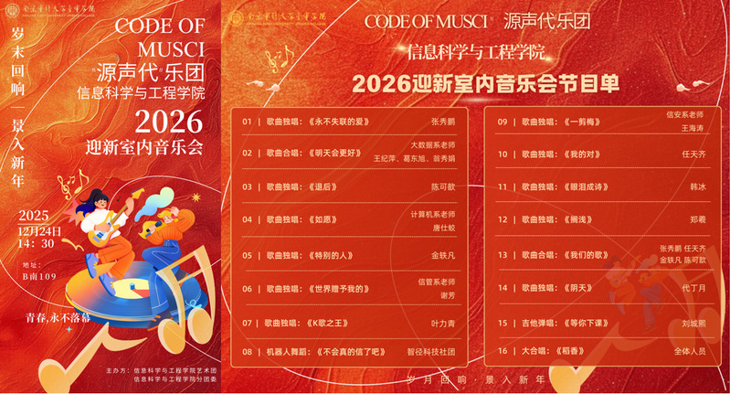 整場音樂會旋律跨越專業(yè)界限,音符聯(lián)結(jié)師生情感,既是對2025年的溫暖總結(jié),也是對2026年的美好展望。活動在熱烈的掌聲中圓滿落幕,充分展現(xiàn)了信息科學(xué)與工程學(xué)院師生團結(jié)向上、全面發(fā)展的精神風(fēng)貌。